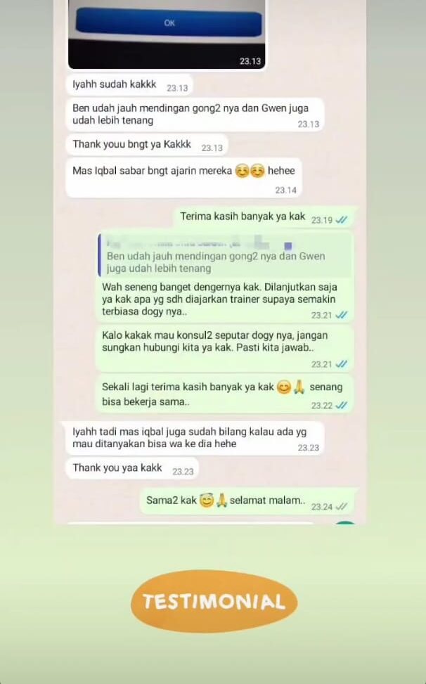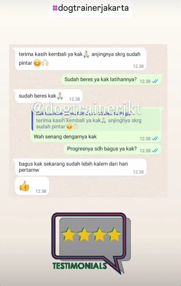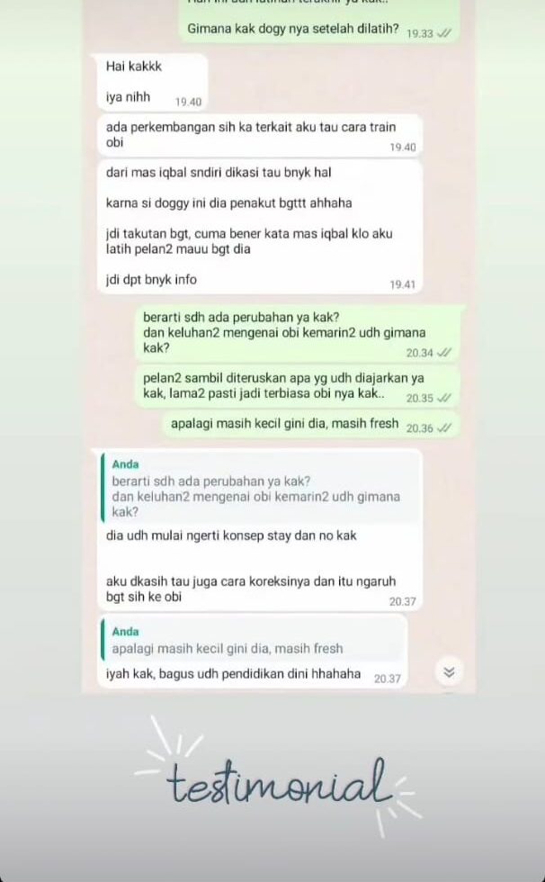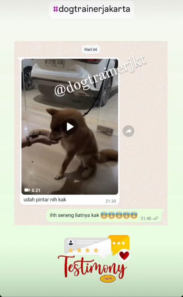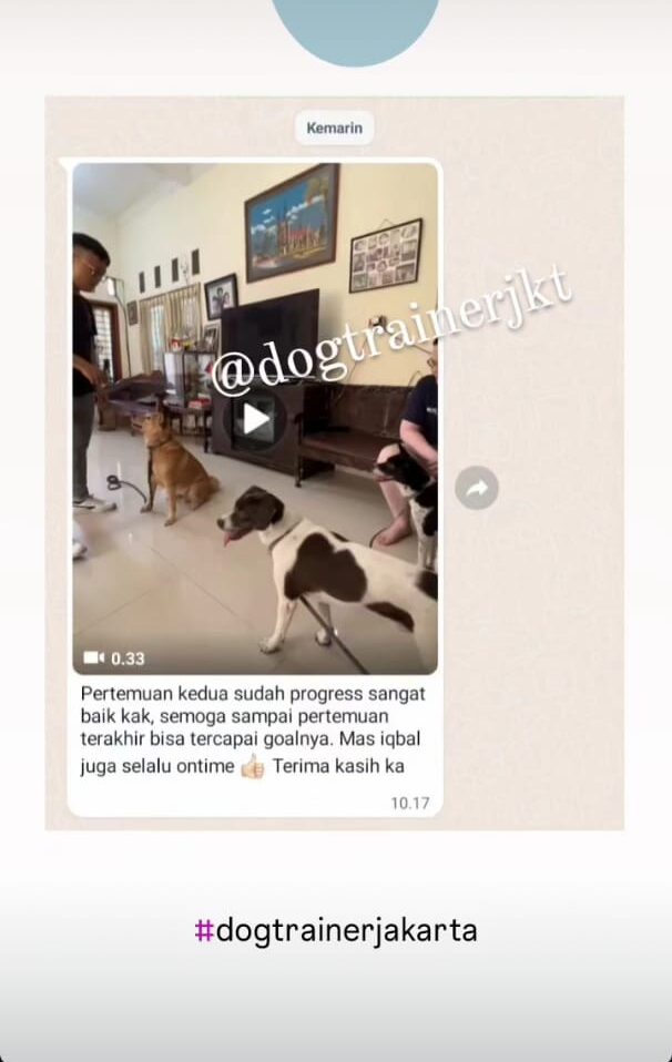 “Nggak nyangka dalam beberapa kali sesi saja perubahan anjing kami sudah terlihat. Yang tadinya kalau dipanggil suka cuek, sekarang langsung datang. Jalan pakai leash juga sudah lebih santai. Terima kasih DogTrainerJKT.”
